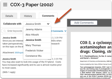 If the document owner has shared with multiple collaborators, they can only view and respond to the comments of one reviewer at a time, and all threads are restricted to both reviewers. Document owners can switch between collaborators from the dropdown list labeled Collaborate with…