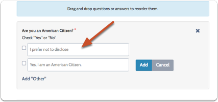 Once an applicant selects a multiple choice option, they can change their response by selecting another option, but they cannot de-select an option in order to leave the question blank. If you are creating an optional question that does not apply to all applicants, you may want to consider including the “other” option so that applicants can indicate that they chose an answer by mistake.