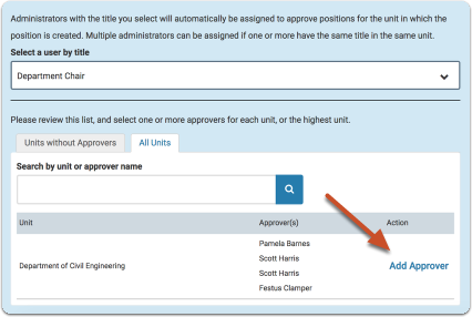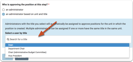 Users with the role of Administrator in Faculty Search (FS) can also be assigned a title such as Dean or Department Chair, in the unit they administer and all units below. This title will allow them to approve positions created by all units they administer before they can be posted. Titles are created on the Titles tab of the Users & Groups page of FS and then assigned to administrators when editing the user's permissions. During the process of creating approval templates, the titles created here become available when selecting an administrator to fill a given title for a given unit. The administrator creating the approval template has the option to name an administrator as the approver of the position at that step based on unit and title. The administrator(s) who hold the title selected will automatically be appointed to approve the position at the current step for the unit in which the position was created.