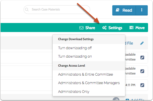Control access to materials under the Change Access Level section of the Settings dropdown on the action bar.