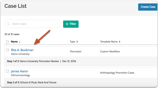 - Navigate to the Cases and click the hyperlinked Name of the desired candidate's case to view their case.