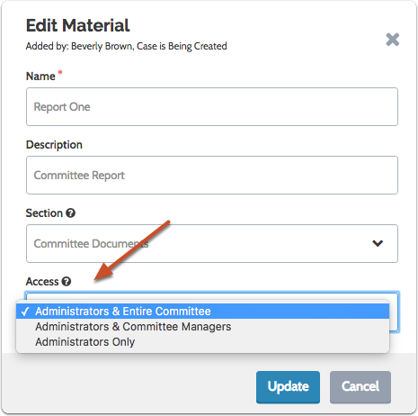 Change Access Level: You have the option to set the document to Administrators & Entire Committee, Administrators & Committee Managers, or Administrators Only.