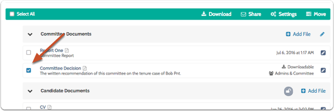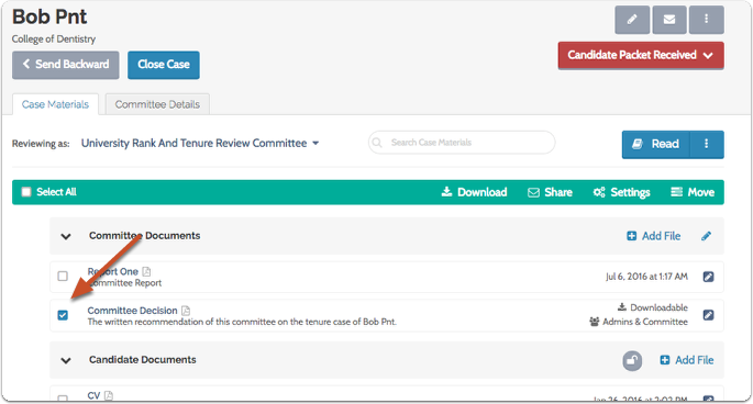 Unit Administrators, Case Managers, and Committee Managers can share packet materials such as committee documents with the candidate, and allow or disallow a candidate's response or rebuttal to the shared material. This is useful, for example, if the organization requires that the candidate is given an opportunity to respond to a committee's decision about the candidate, or if for any reason the candidate needs to view or respond to materials added to their case packet. This article explains the process of sharing files with a candidate and allowing or disallowing a candidate's response or rebuttal.