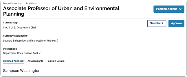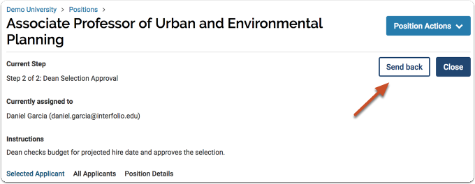 - Click Approve to move to the position approval page or click Send back to select a prior step to send the position back to. If the position is at the final step in the approval process, click Close to approve and close the position.