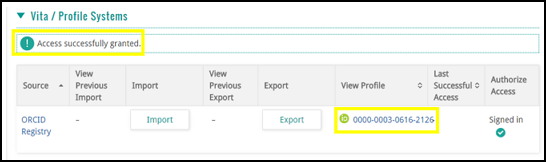 3. After you Authorize Access on the next screen, you will be automatically redirected back to FAR. There, you will see a message confirming that access has been successfully granted, along with a hyperlinked ORCID URL in the View Profile column.