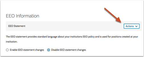 - Click the Actions dropdown to select whether you would like to use the government-mandated EEO statement or create a personal EEO statement for Administrators to use when creating positions.